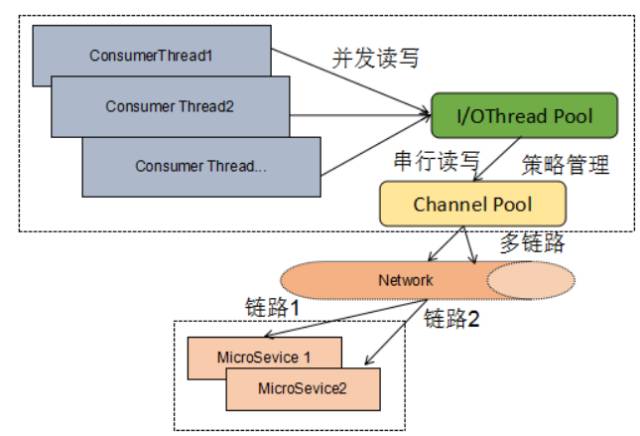 由于网络通信本身通常不是系统的瓶颈,因此大部分服务框架会采用多线程+单个通信链路的方式进行通信,原理如下所示: