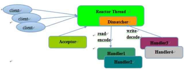 利用JDK的异步非阻塞I/O,可以实现一个I/O线程同时处理多个客户端链路,读写操作不会因为网络原因被阻塞,I/O线程可以高效的并发处理多个客户端链路,实现I/O多路复用,它的工作原理如下所示: