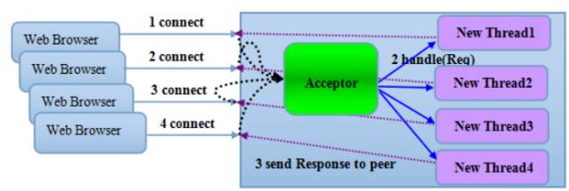 采用BIO通信模型的服务端,通常由一个独立的Acceptor线程负责监听客户端的连接,接收到客户端连接之后为客户端连接创建一个新的线程处理请求消息,处理完成之后,返回应答消息给客户端,线程销毁,这就是典型的一请求一应答模型。该架构最大的问题就是不具备弹性伸缩能力,当并发访问量增加后,服务端的线程个数和并发访问数成线性正比,由于线程是JAVA虚拟机非常宝贵的系统资源,当线程数膨胀之后,系统的性能急剧下降,随着并发量的继续增加,可能会发生句柄溢出、线程堆栈溢出等问题,并导致服务器最终宕机。