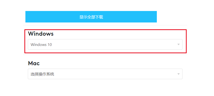 2、 进入到下载页面后,将页面下拉到最下边,有“显示全部下载”的按钮,选择对应的系统页面会显示出所有的适配该操作系统的程序,选择你鼠标对应的版本,一般正版的鼠标最新的系统都是支持的(因为我之前买过盗版的鼠标 - _-!)。上一张图。因为我的win系统,mac对应版本下载。