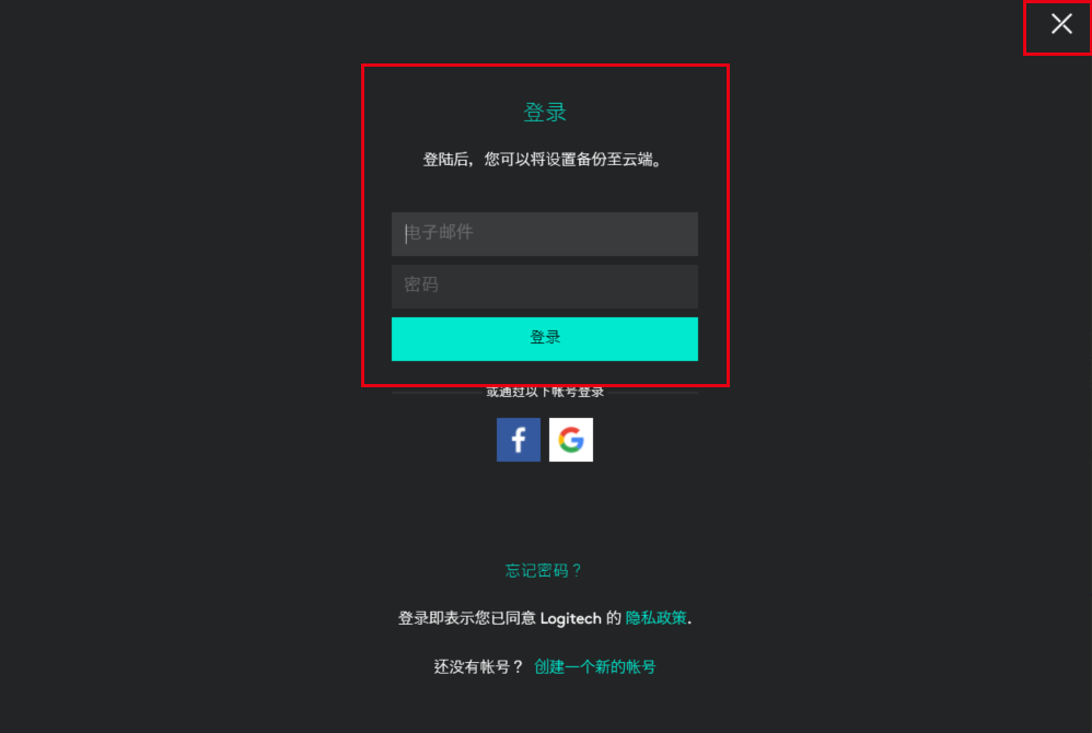 5、安装之后会自动进入到options软件,进入软件后,就可以登录你的账号了,此过程仍然不需要翻墙,现在国内的网也是可以登录上去的,但是有些人会遇到登录错误等情况,那是罗技服务的原因,别想是你自己电脑的原因,我用6台从老-->新的电脑测试过,那么你可以暂时跳过登录界面,等过一些时间再登录,跳过登录就是那个“X”,对此我也困扰了一些时间,怪我太笨吧。