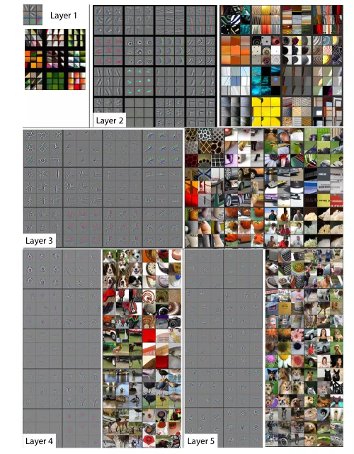 请看下图,是分别经过不同层数的神经网络层时的情况(显示的图像,比较抽象)