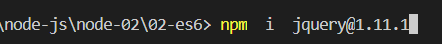第四步:输入以下指令,npm i + 模块名(后面可以使用@版本号),即可下载相应版本,如图下载的是当前最新的jQuery版本