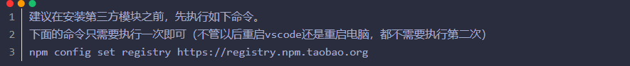 第三步:安装本地模块之前,可以输入以下指令,将镜像网站改为国内淘宝前端团队开发的备份网站,可以使下载速度快一点,因为npm网站的服务器在国外,下载速度很慢。