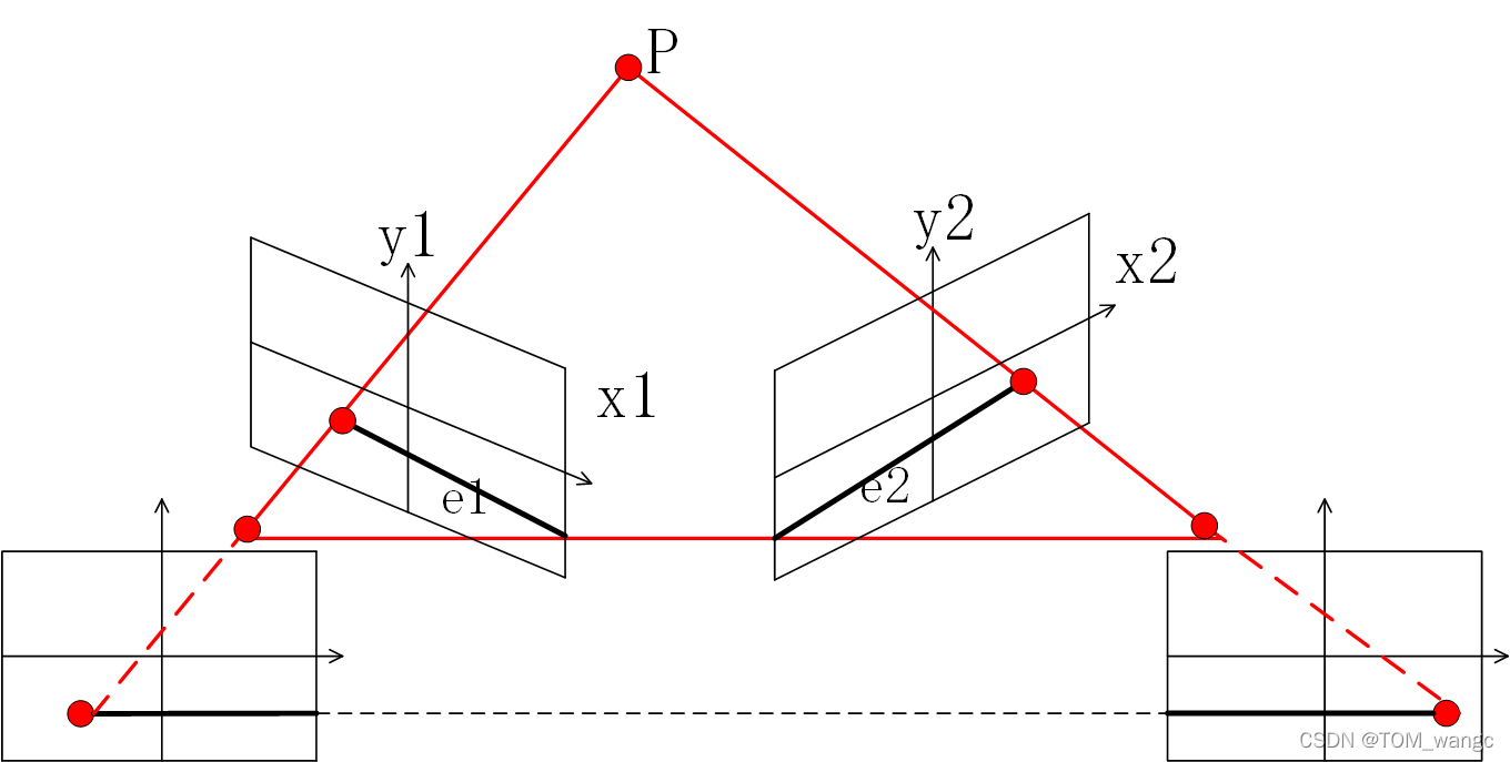 什么是极线呢?如下图所示,两个相机,p是空间中一点,P和两个相机中心点形成了三维空间中的一个平面,称为极平面。极平面和两幅图像相交于两条直线,这两条直线为极线。p在相机C1中的成像点是P1,在相机C2中的成像点是P2,但p的位置事先是未知的。