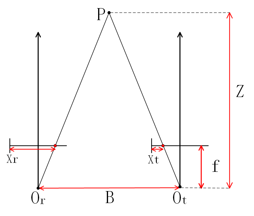 d:称为视差,即物体在左右相机中成像的点距成像平面边缘的距离(成像点的在图像平面上的像素坐标的行像素)。