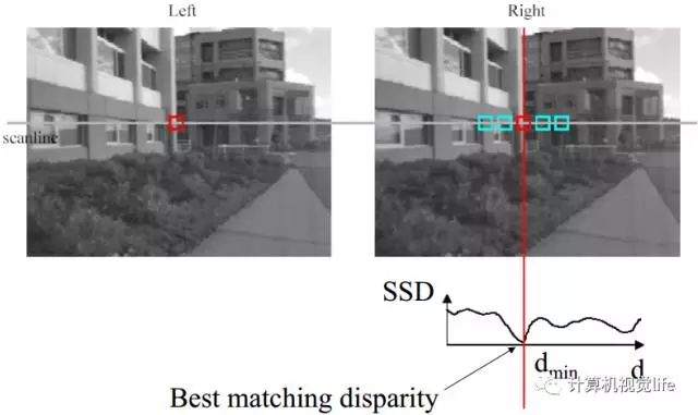 使用滑动窗口来进行匹配。如下图所示。对于左图中的一个像素点(左图中红色方框中心),在右图中从左到右用一个同尺寸滑动窗口内的像素和它计算相似程度,相似度的度量有很多种方法,比如 误差平方和法(Sum of Squared Differences,简称SSD),左右图中两个窗口越相似,SSD越小。SSD值最小的位置对应的像素点就是最佳的匹配结果。