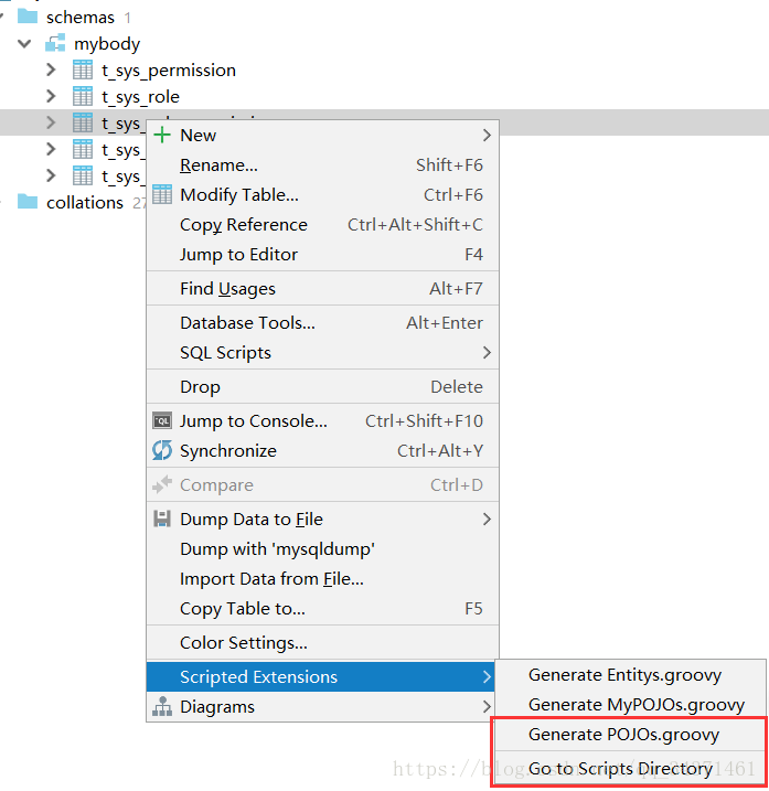 连接好了如上图所示,可以看到自己的数据库和表,选择一个表右键,网上教程一般到这里结束,都是选择说Generate POJOs.groovy,然后在弹出窗口选择需要生成的文件夹所在即可。