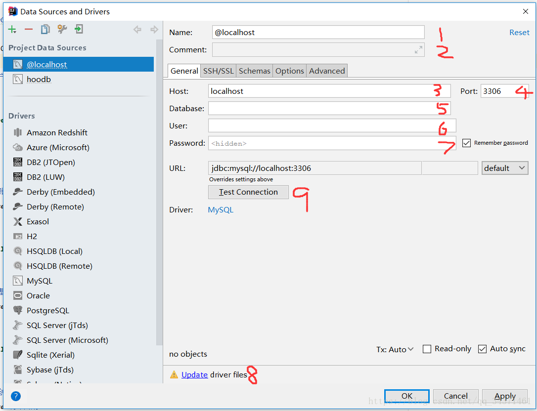 9、填写自己的数据库连接url,然后可以点击9所在按钮进行测试连接,本地连接失败检查是否开启了mysql服务