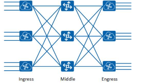 我们将网络沿Middle设备对折,将入节点和出节点放在一侧,我们将得到与前面讨论过的Spine+Leaf相同的网络架构,如下图所示