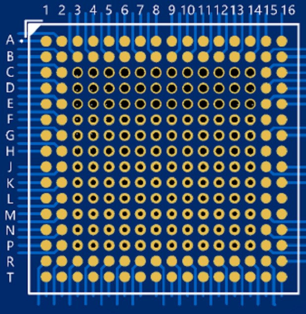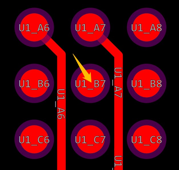 不知道大家在画PCB的时候会不会遇到这样的情况:芯片的引脚太密,某个引脚想要走线出去但是完全被包围了,尤其是在BGA封装的芯片中。例如下图中的U1_B7引脚就没有办法在走线出去,四周都被包围了: