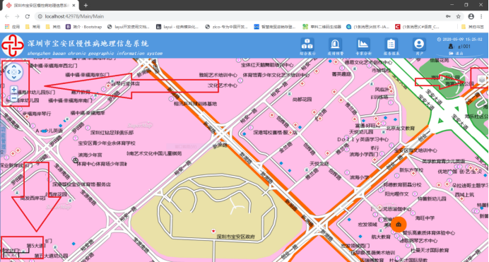<script type="text/javascript"> //一、创建map对象 var map,url ="http://localhost:8090/iserver/services/map-SZCHWork/rest/maps/SZBA",// 设置map访问的GIS服务地址 //加载地图方法 function onPageLoad(){ map =new SuperMap.Map("map", { controls: [ new SuperMap.Control.LayerSwitcher(),//地图图层切换控件,可以查看图层信息和控制图层显示,默认位于地图右上角 new SuperMap.Control.ScaleLine(),//比例尺控件,显示地图的比例关系,默认位于地图左下角 new SuperMap.Control.PanZoomBar(),//平移缩放类。 用于平移缩放地图,默认情况下垂直显示在地图左上角。 new SuperMap.Control.Navigation({ dragPanOptions: { enableKinetic:true } }),//地图浏览控件,监听鼠标点击、平移、滚轮等事件来实现对地图的浏览操作。 new SuperMap.Control.ZoomBox({out:true}),//该类实现在地图上绘制矩形区域,放缩地图的操作。 new SuperMap.Control.Attribution(),// new SuperMap.Vector (),//矢量元素覆盖物图层。可以以丰富的形式展示点、线、面等地理矢量图形 ], allOverlays:true }); //动态分块图层,用来对接SuperMap iServer 8C的分块动态REST图层服务。 layer =new SuperMap.Layer.TiledDynamicRESTLayer("行政图", url,{ transparent:true, cacheEnabled:true }, { maxResolution:"auto" }); layer.events.on({"layerInitialized": addLayer }); function addLayer() { //异步加载图层 // 向Map中添加图层 +Markers(医院) map.addLayers([layer, markerhospital,vectorLayer]); //显示地图范围,中心点和缩放级别 map.setCenter(new SuperMap.LonLat(113.88, 22.56), 6); } function ZoomIn() { map.zoomIn(); }//放大function ZoomOut() { map.zoomOut();}//缩小 </script> |