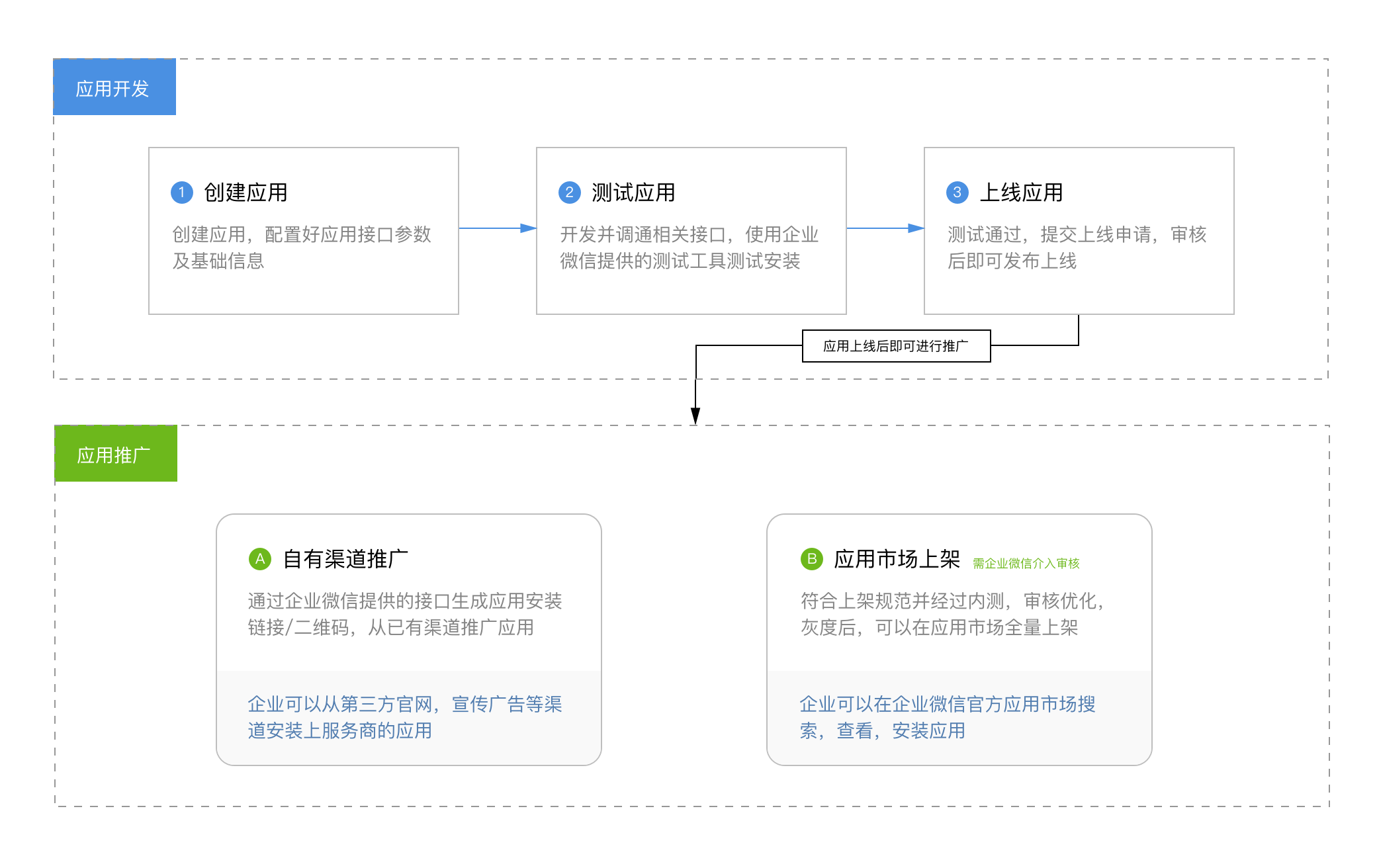 上线应用->自有渠道推广,用户达到企业微信要求,程序达到优先要求->申请上架应用->企业微信联系联合体验优化,灰度测试优化->应用上架出现在企业微信应用市场