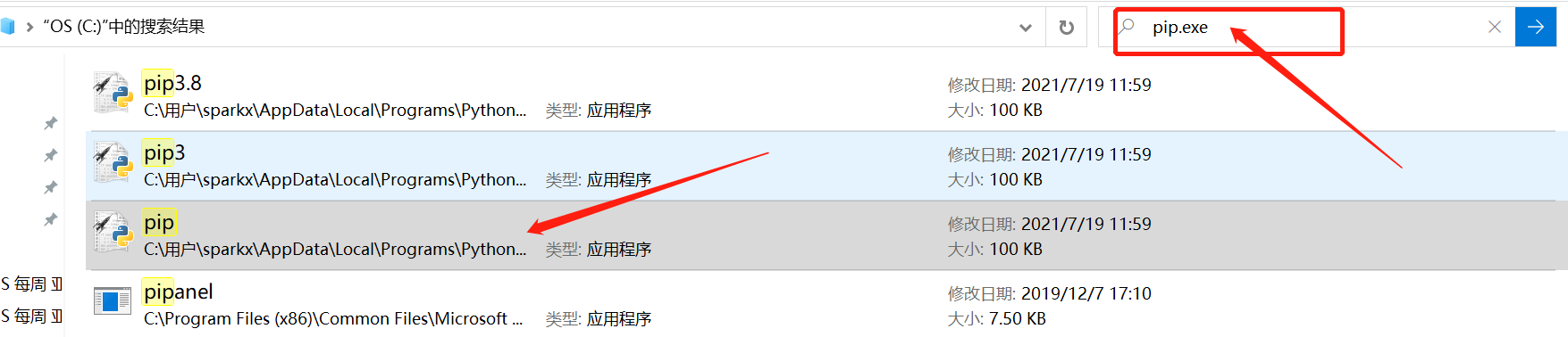 方法如下,检索你的计算机,在搜索框命令栏,搜索'pip.exe',回车键确定: