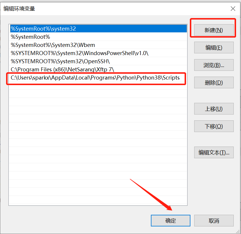 选择,新建(将pip的路径,粘贴到新建的一行里),在点击确定