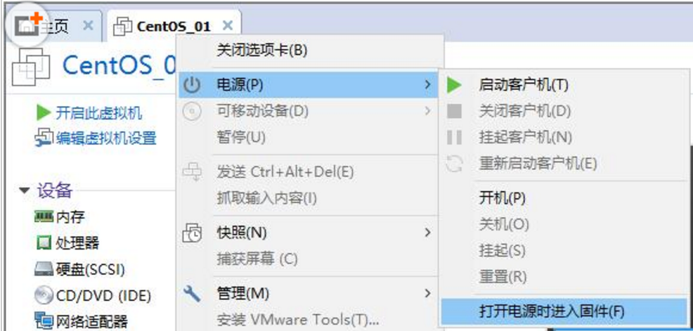 右击虚拟机,选择电源—打开电源时进入Bios,进入Bios