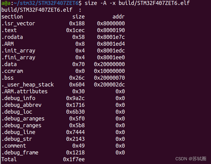 编译此工程得到STM32F407ZET6.elf可执行文件,可以使用下述命令来查看输出可执行文件中各段的分配及大小,如图6。