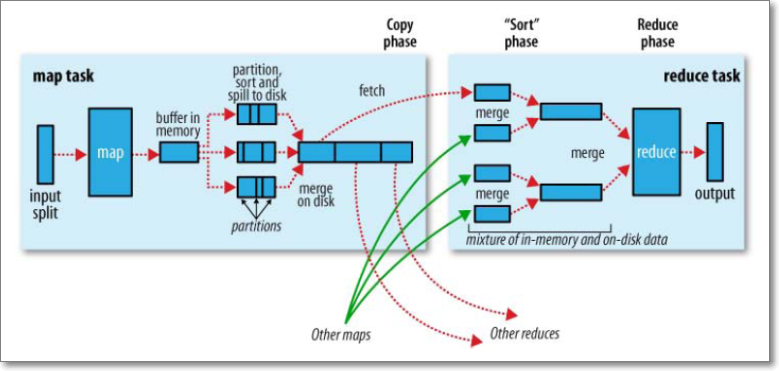 合并溢写文件:在map task完成之前,所有溢出文件会被合并成一个大的溢出文件;且是已分区、已排序的输出文件