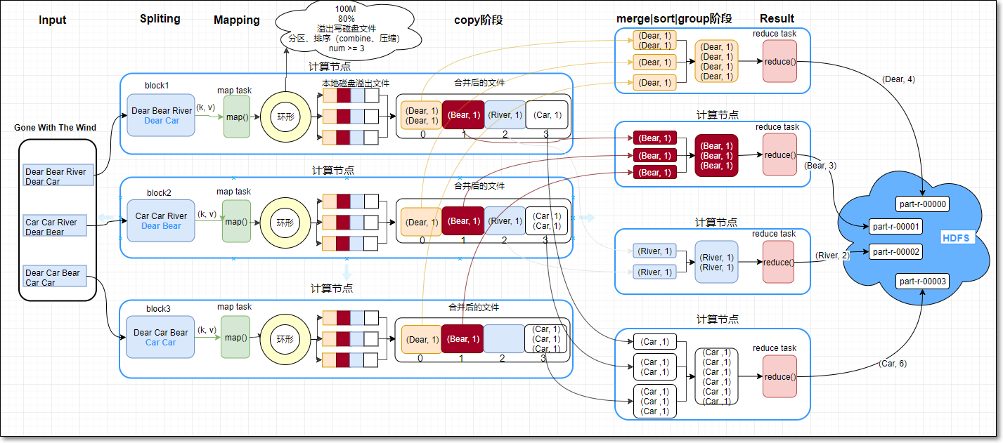 每个map任务都有一个对应的环形内存缓冲区;输出是kv对,先写入到环形缓冲区(默认大小100M),当内容占据80%缓冲区空间后,由一个后台线程将缓冲区中的数据溢出写到一个磁盘文件