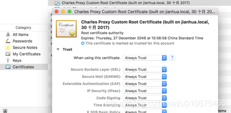 如图2,Charles——>Help——>SSL Proxying,点击”Install Charles Root Certificate”, 这个会自动安装对应的证书到电脑上,过会儿去KeyChain Access 上检查应该安装了证书。——>如果证书上是红色X表示没被信任,需要双击打开配置——>Trust,选择’Always Trust’,关掉对话框,红色就消失,证书被安装好且可用了.