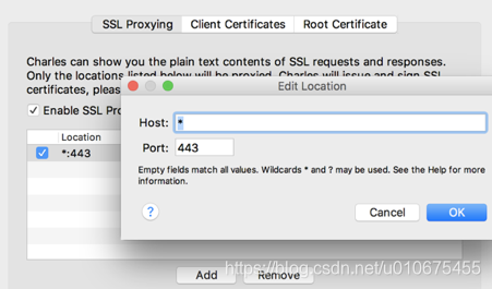 无论是抓取电脑或者手机上HTTPS请求时,要看到正常请求内容,需要配置Proxy——>SSL Proxying Setting, 勾选上Enable,如图5,Add Location(相关请求Host,这里Port都是443;没有特殊需求,一般Host设置为全部 *就行)