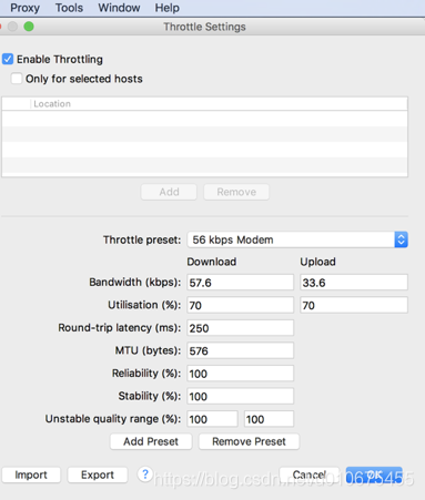 Charles——>Proxy——>Throttle Settings,选上Enable,同时在Throttle preset可以选择各种网络和网速,也可以在Location中设置只在某些host下网络模拟。