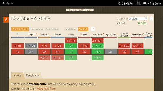 可以看到,所有支持navigator.share(...)的浏览器及其版本都罗列出来了。