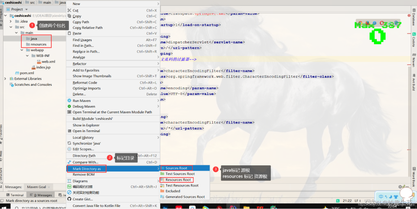 创建java resources文件 配置根目录 复制springmvc.xml到resources 目录下