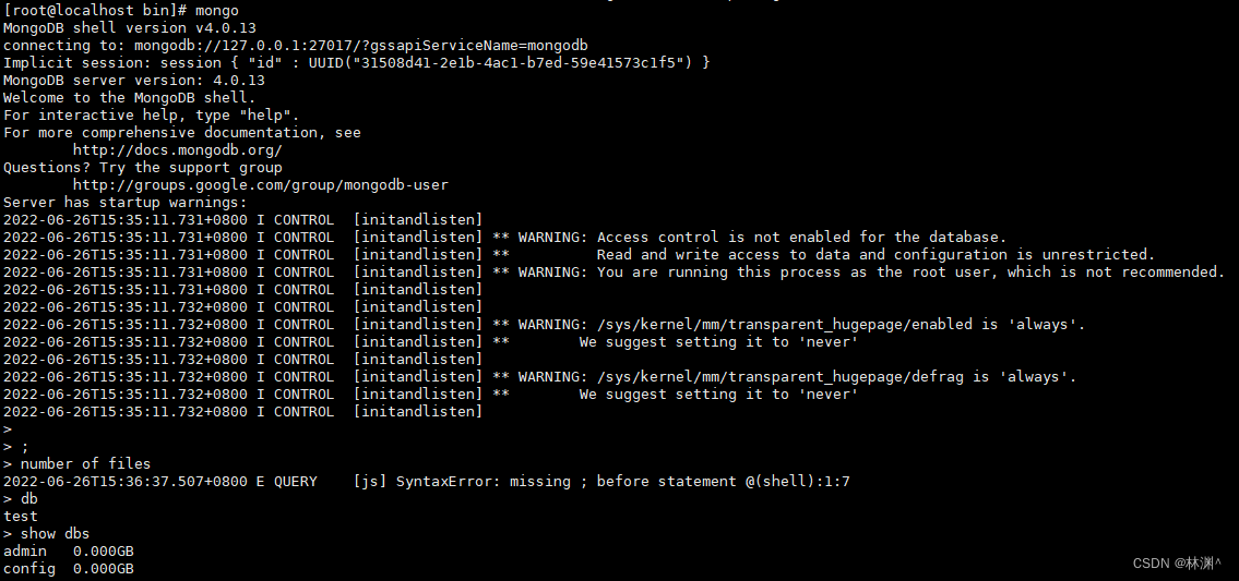 mongo显示如下,已经成功进入mongo数据库了,默认是进入的是test数据库,show dbs 查看当前所有数据库。
