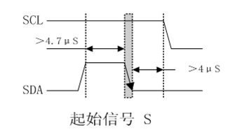 开始信号: SCL 为高电平时, SDA 由高电平向低电平跳变。