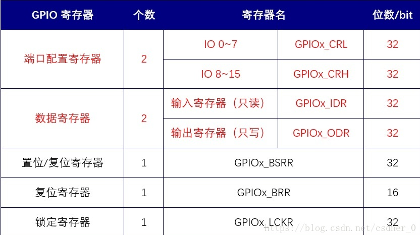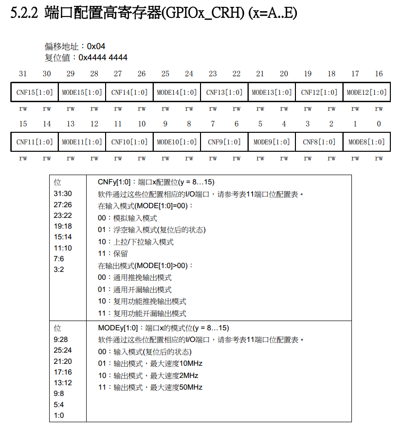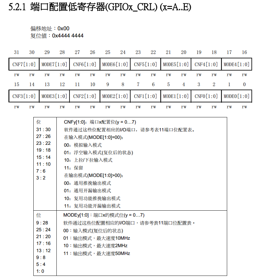 CRL、CRH是2个控制端口模式的寄存器,CRL控制引脚的0-7脚,CRH控制引脚的8-15脚。STM32的每组IO口有16个,(PA0–PA15)、(PB0–PB15)……(PG0–PG15),而我们SDA用到的是PB7,所以要用到的就是CRL寄存器。