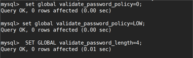 mysql> SET GLOBAL validate_password_length=4;