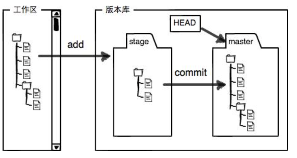 2. 仓库(版本库):工作区内有一个隐藏的目录.git,就是Git的仓库。仓库里存放了暂存区、还有第一个分支master,以及指向master的一个指针HEAD