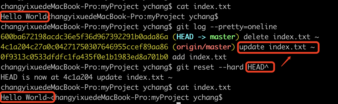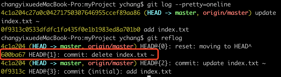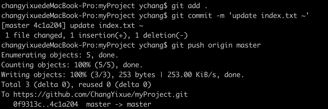 changyixuedeMacBook-Pro:myProject ychang$ git commit -m 'add index.txt'