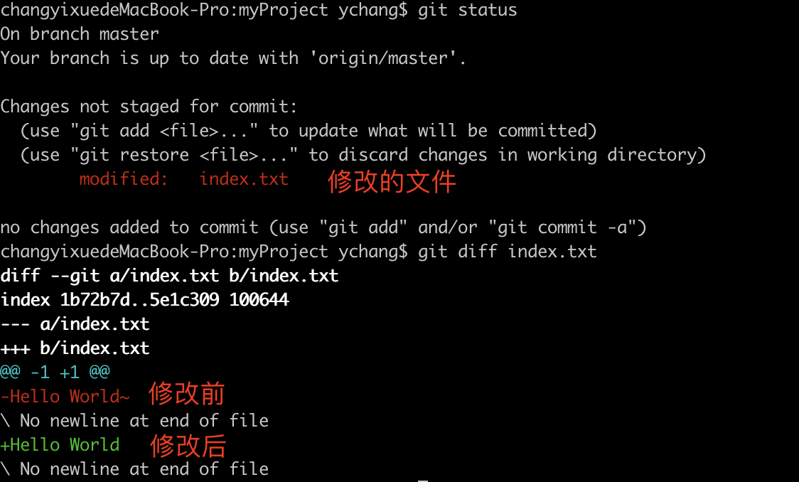 场景1:比如在本地修改了文件index.txt后,add之前,我们可以先用git status查看本地仓库有变动的文件状态。那如果我们想看看某文件具体修改了哪些内容,就可以用git diff <fileName>