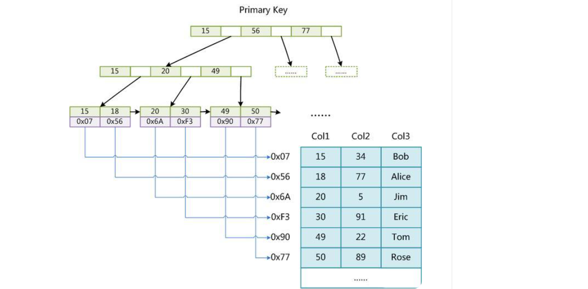 上面提到了myisam存储引擎,数据的存储形式是非聚集形式,数据和索引都会单独的存储,叶子节点和非叶子结点都会存储数据,如上图索引的叶节点都会存放数据文件对应的地址,如图所示: 比如查找ID=49的数据 primary key.代表我们主建索引,先利用索引数找到对应的索引文件,然后通过索引文件,找出关联数据的地址 0*90 然后找出数据文件frm文件中的数据