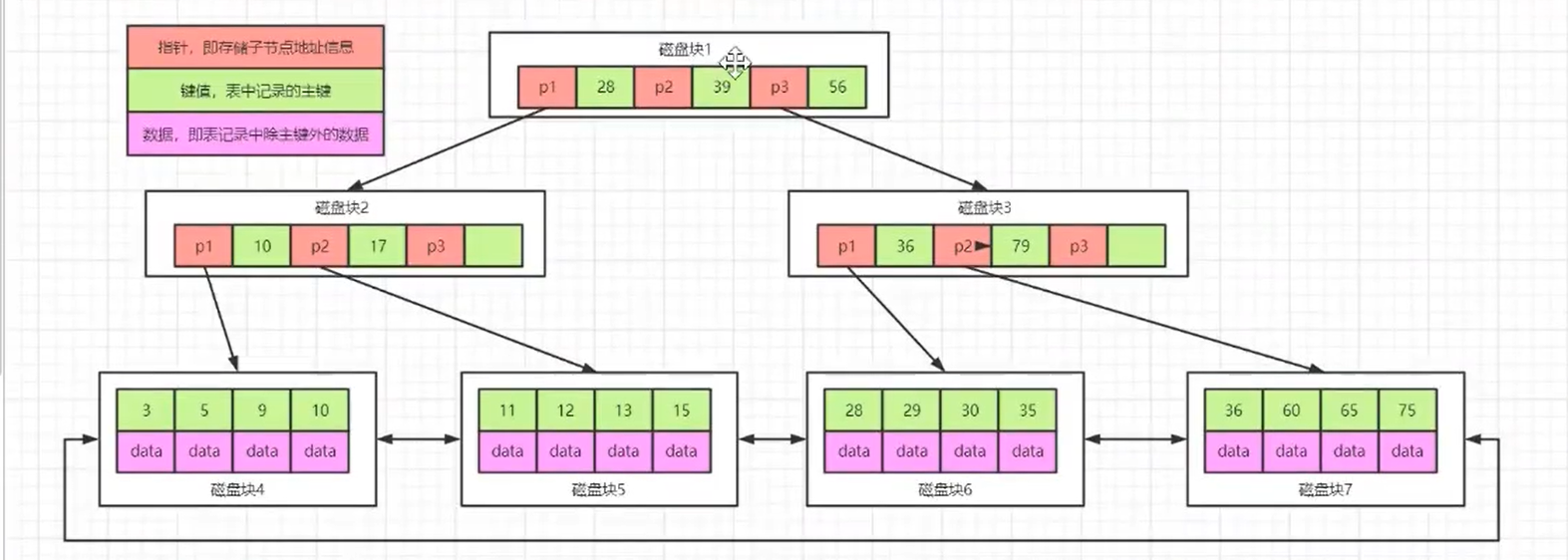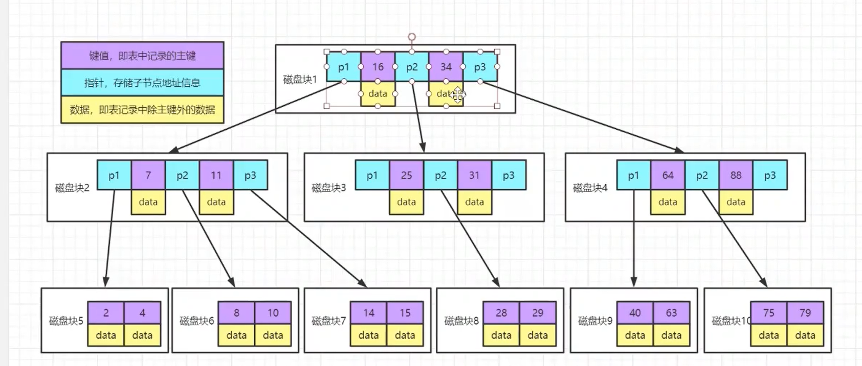 每个节点都会占用一个磁盘块,每一个磁盘块代表1次IO,然而每个磁盘块包含指针(指向下个磁盘块的地址)、键值、以及对应的数据地址。例如找出ID==8的数据,会先从根节点对比 16、34 则发现 8 < 16 即得到P1的指针。然后找到对应的磁盘块,以此类推。