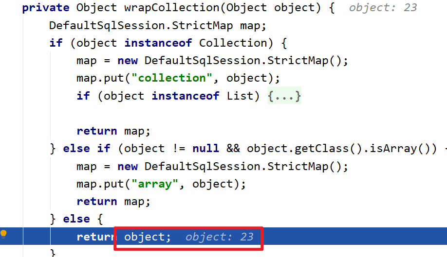 来看下一步,executor.query( ms,this.wrapCollection(parameter),.....)该方法套方法,所以先执行wrapCollection( )方法,先进入该方法,如下:我的参数是23不是collection类型,所以返回了object=23;