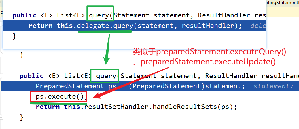 上面query()方法可以得出结论:mybatis底层执行增删改查是通过PreparedStatement的execute()方法