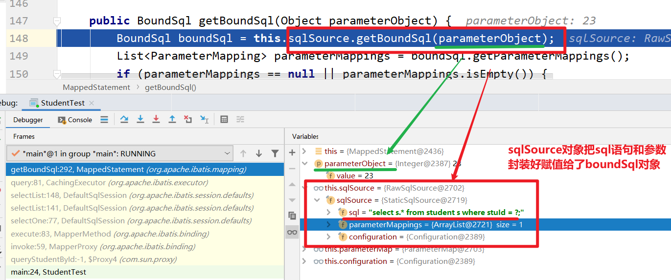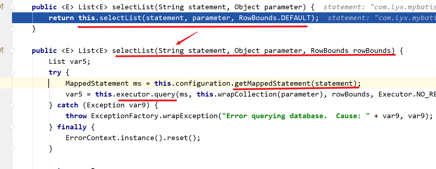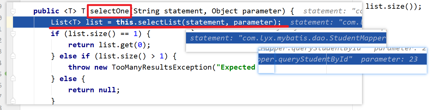 如下图,可以看到selectOne(statement,parameter)又调用了selectList()方法:看蓝色背景的注解:该selsectList()方法的形参statement的值为“com.lyx.mybatis.dao.StudentMapper.queryStudentById”,形参parameter:23。