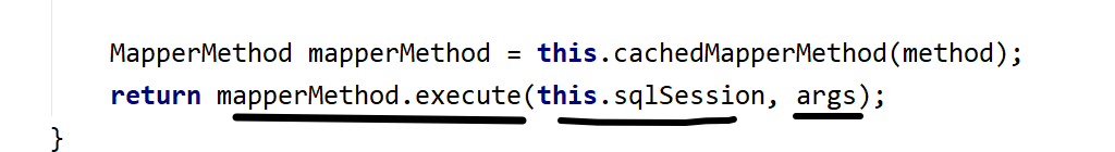 mapperMethod.execute(sqlSession, args):实际调用增删改查的方法,依靠了sqlSession中的configuration和 executor. .还有调用queryStudentById(23)传递的参数args,