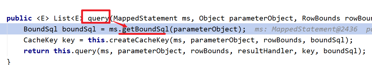 看到一个query()方法调用了getBoundSql()方法,进入getBoundSql()方法看看如何执行