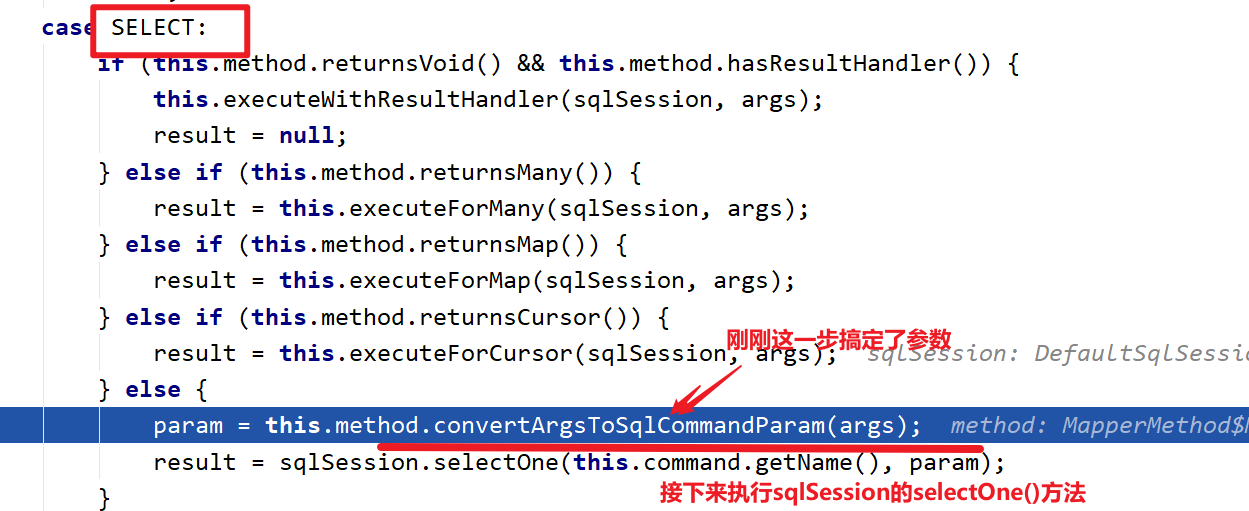 看如何处理args:method.convertArgsToSqLCommandParam(args)处理参数,我的queryStudentById(23),给的参数是23, 参数给了该方法