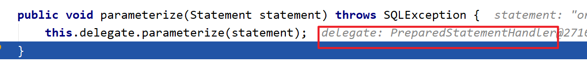 进入delegate.parameterize()方法可以看到如下图,该parameterize方法经statement对象强转为PreparedStatement