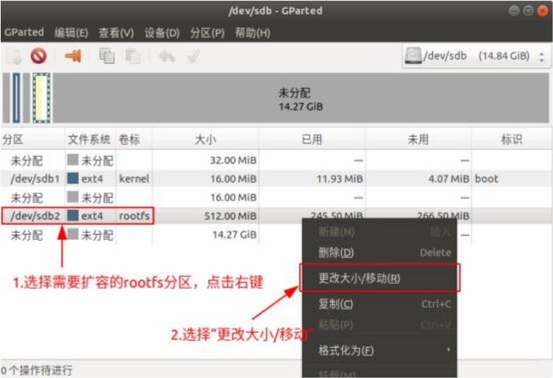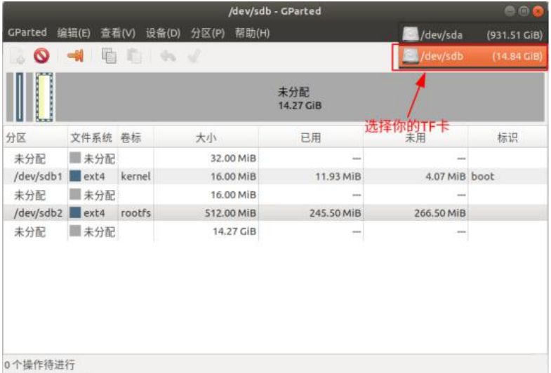 3) 用读卡器将烧录好 OpenWRT 镜像的 TF 卡插入电脑,并打开 gparted,在右上角 选择你的 TF 卡,一般为/dev/sdb