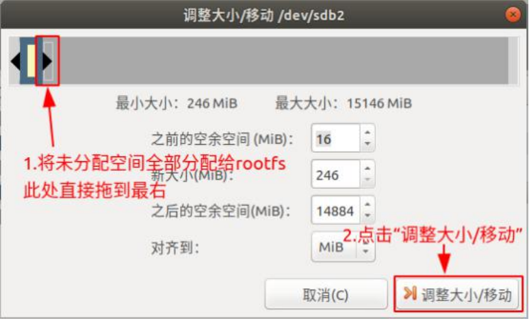 5) 将未分配的空间全部分配给 rootfs,将滑块拖到最右边,然后点击“调整大小/ 移动”