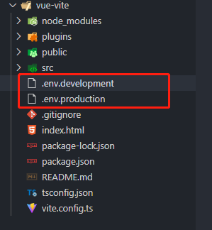 }3、新增.env.development(开发环境)与.env.production文件,并写入以下信息,注意内容必须全部大写,前缀必须是VITE