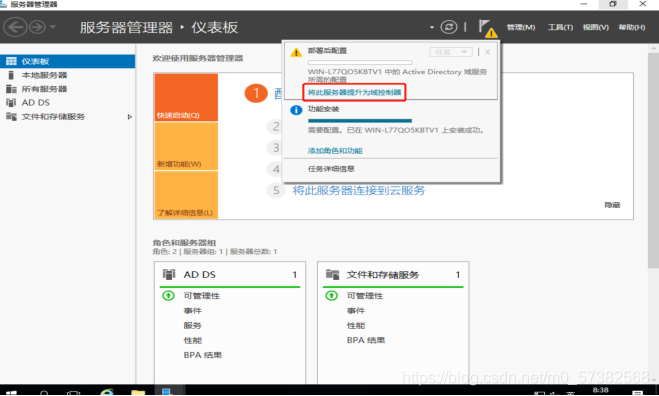 3.安装完成后在黄色三角处选择将服务器提升为域控制器
