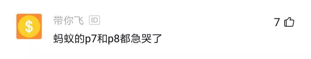 还有人说,蚂蚁的办公室又欢呼了,上次是高p们欢呼财务自由,这次是p5p6们欢呼,谁让你们不带我们玩?这下大家都没得玩了吧?p7p8们估计都急哭了。