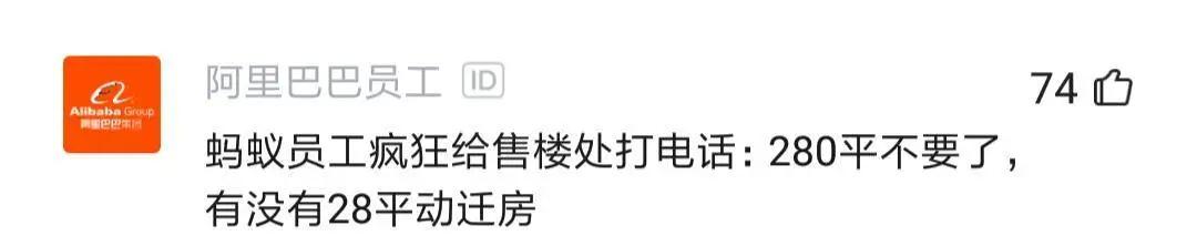网友们纷纷猜测蚂蚁的兄弟们是不是已经哭晕在厕所了,当初说人均买得起280平的豪宅,现在全成了泡沫。有人猜测蚂蚁员工此时正疯狂给售楼处打电话,要求把280平的豪宅换成28平的动迁房……